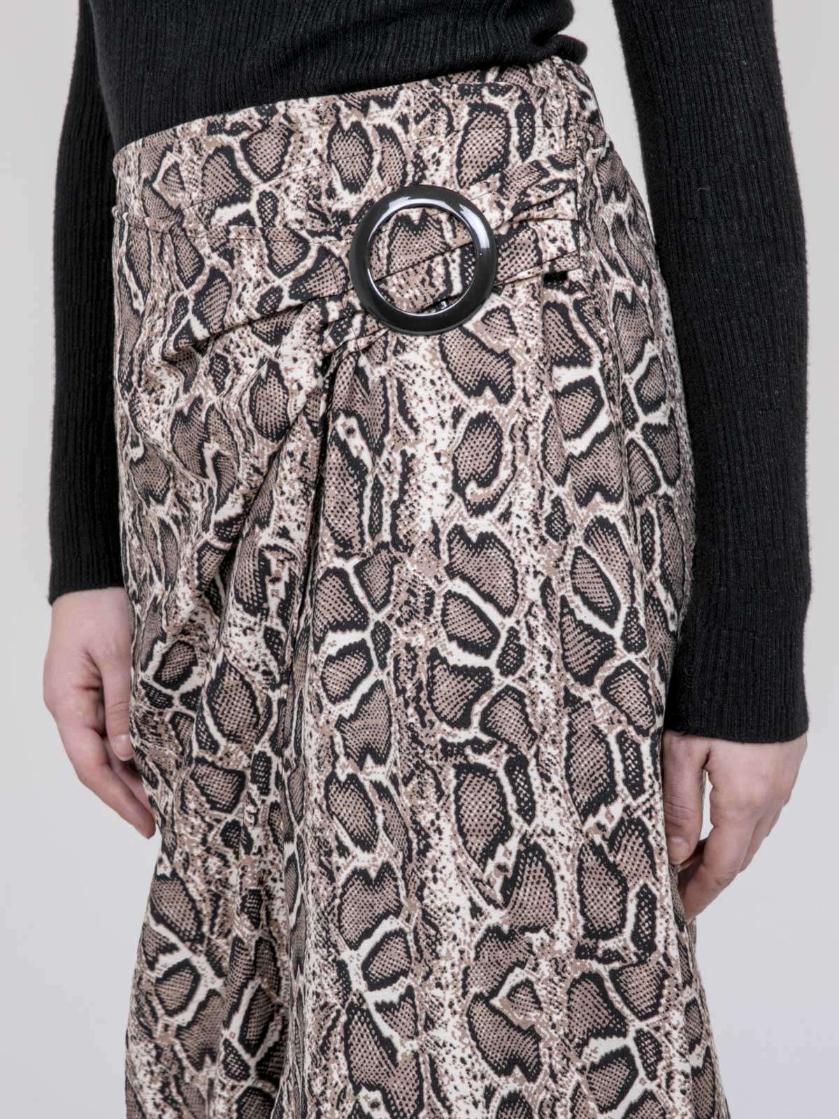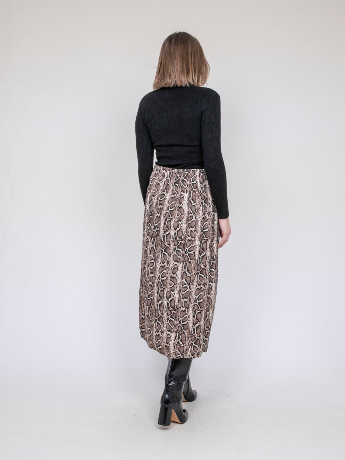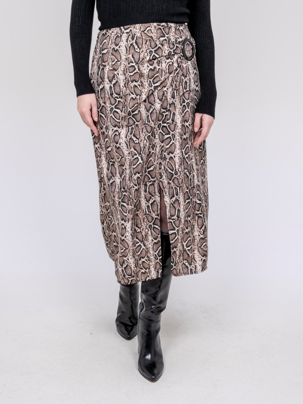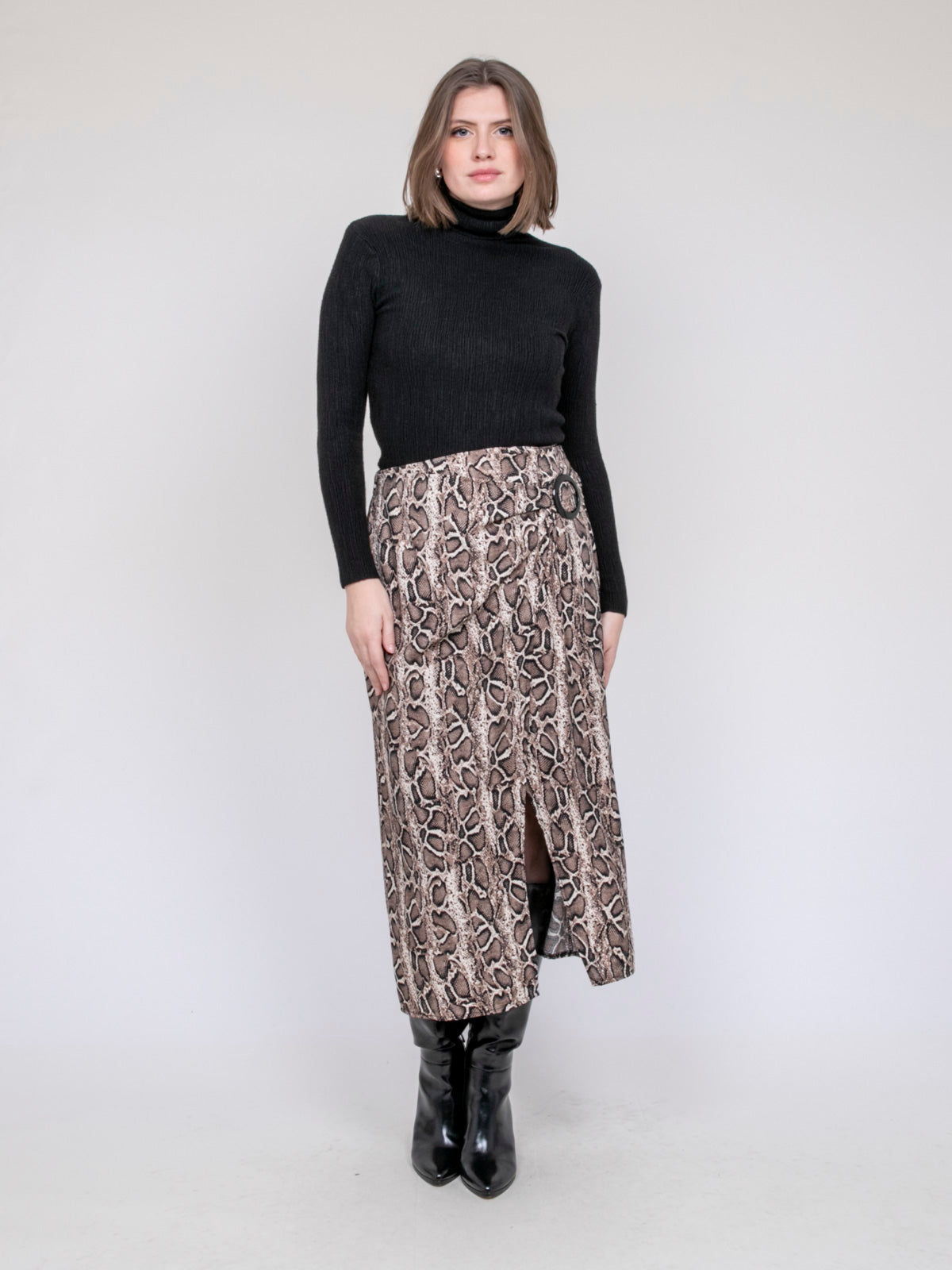Sublimez vos looks d’hiver avec cette jupe midi imprimée python, au style audacieux et raffiné. Sa coupe portefeuille et sa boucle décorative apportent une touche mode affirmée, idéale pour les femmes de caractère qui aiment se démarquer avec élégance.