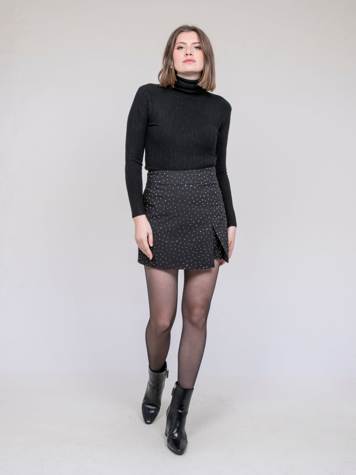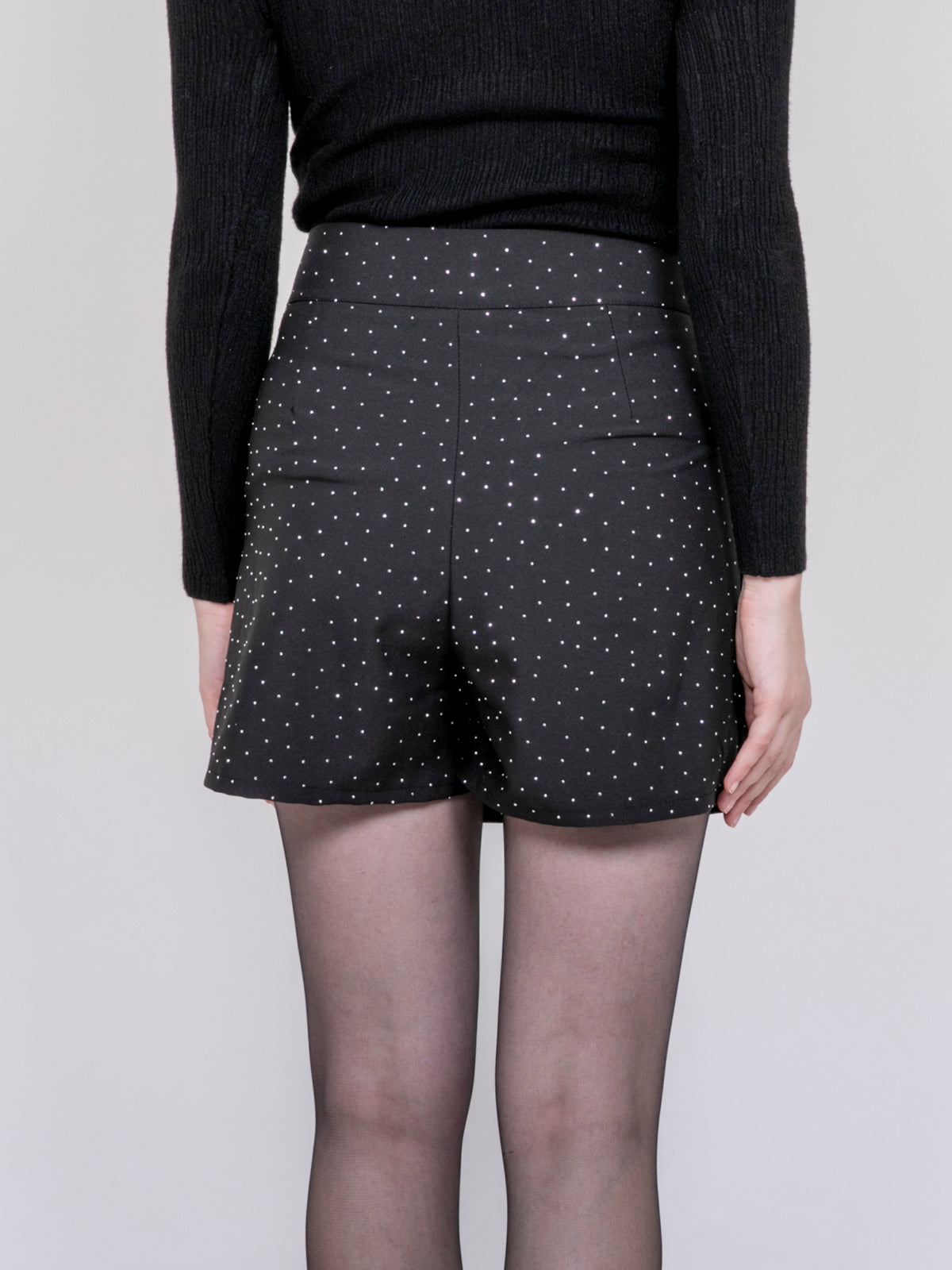 Illuminez vos tenues hivernales avec cette jupe-short noire parsemée de strass scintillants. Alliant confort et féminité, elle dévoile subtilement vos jambes tout en restant ultra-pratique grâce à sa coupe short intégrée. Parfaite pour briller lors des soirées ou apporter une touche chic à un look de jour.