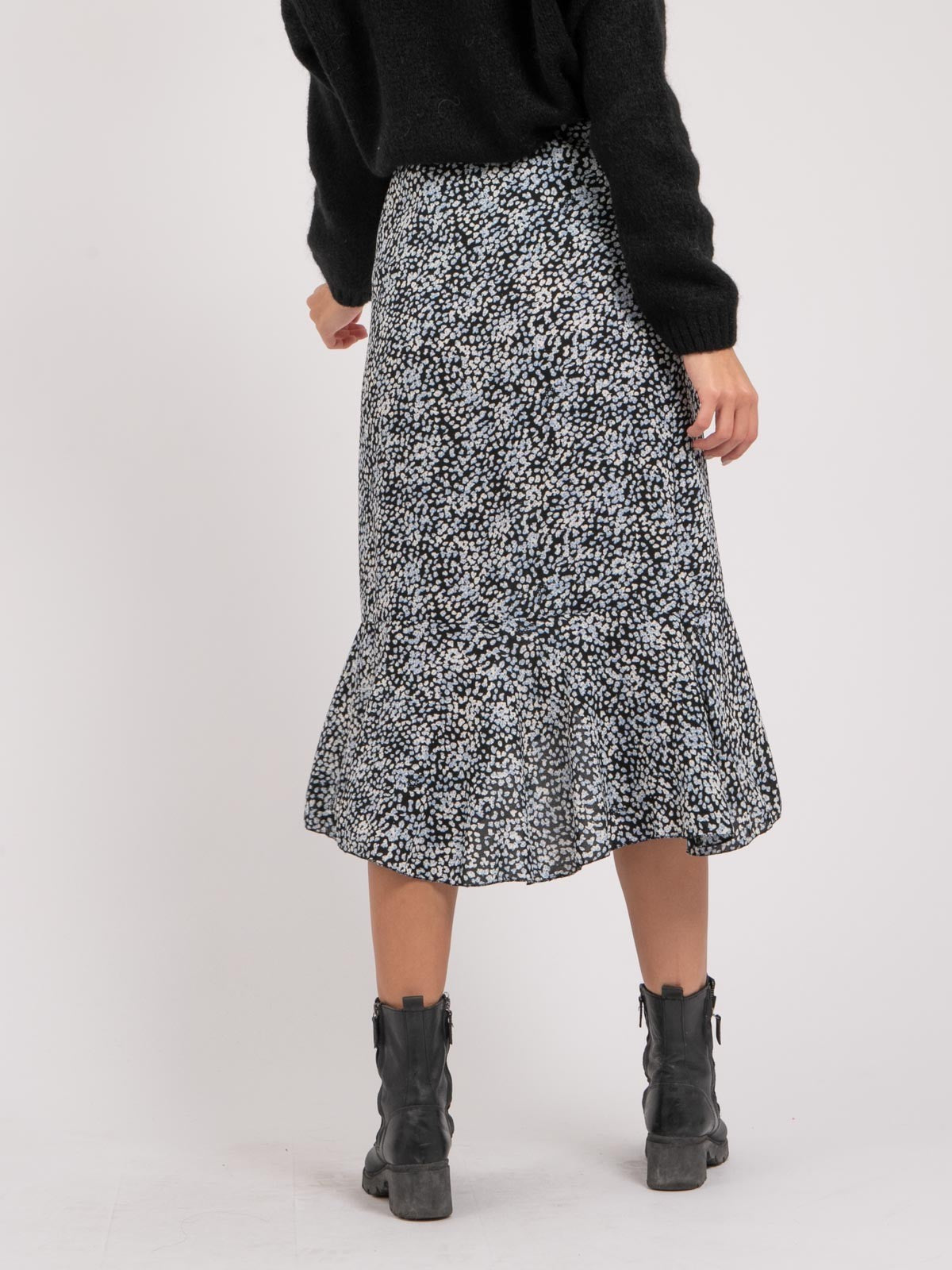 Cette jupe midi à la coupe portefeuille met en lumière l'un des imprimés incontournables de la saison. Fluide et légèrement évasée avec son volant à la base, sa coupe au-dessous du genou rend hommage aux modèles phares des années 70. La pièce se décline dans une nuance noire très élégante, rehaussée de petits motifs bleus contrastés. Twistez le style de cette jupe Dona Lisa avec un caraco et une paire de bottines.