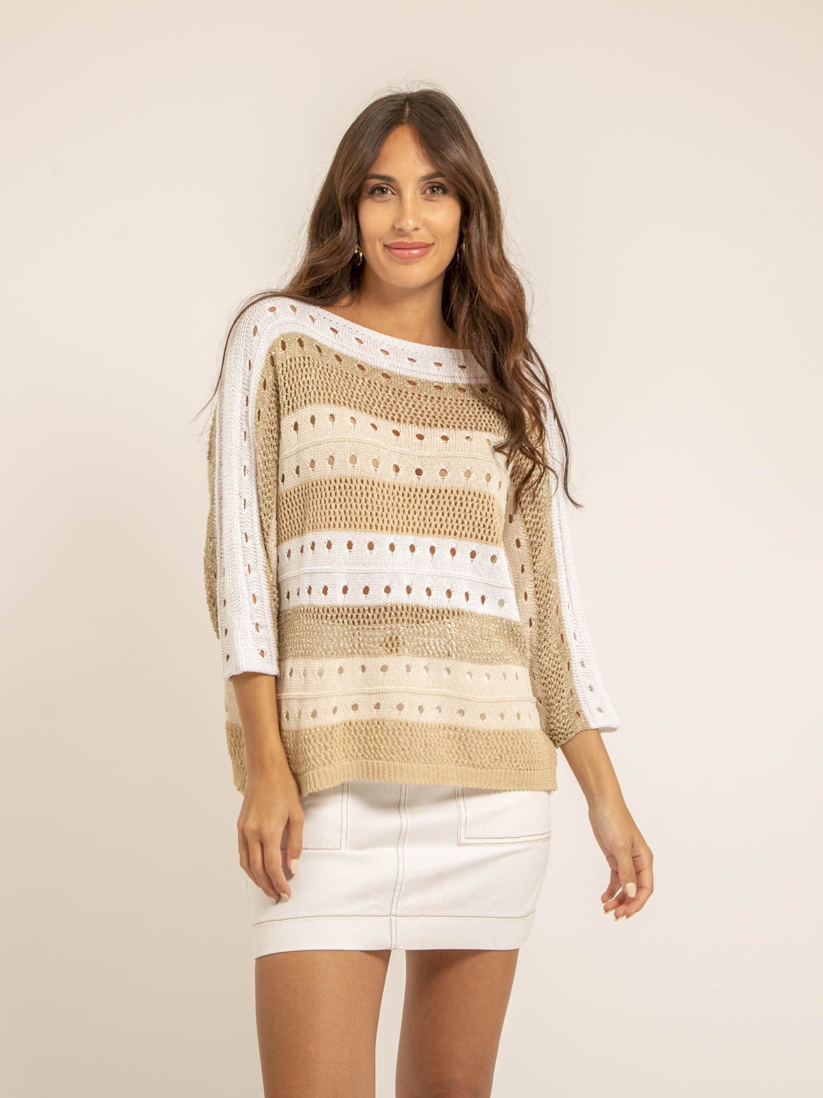 Affichez un style élégant et décontracté avec ce pull en maille ajourée signé Dona Lisa. Ses rayures contrastées en beige, écru et sable lui donnent un charme naturel et raffiné, parfait pour illuminer vos tenues de mi-saison et d’hiver. Léger et confortable, il se porte aussi bien avec un jean casual qu’avec une jupe pour un look plus féminin